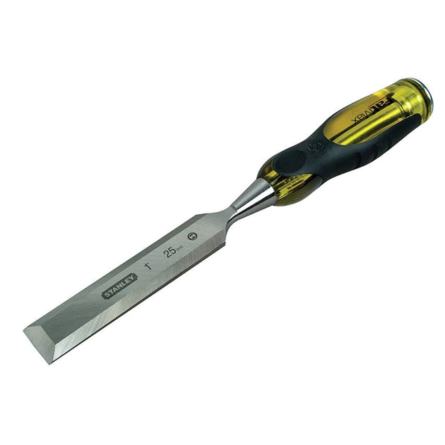 The Stanley FatMax Thru tang bevel edge chisels have an ergonomic handle design incorporating a shatterproof polymer handle. The ergonomic soft grip longer handle is useful for maximum control, feels good in the hand and is comfortable in all applications. The friction welded bolster also gives strength and durability. The steel striking cap can be struck with a steel hammer for increased cutting force and the body resists most solvents. The ISO Standard Blade is made from high quality ball bearing grade steel EN31 and is fully ground and finished for ultimate sharpness and the full length blade guard provides added safety. This FatMax chisel range has a superior design - 50% stronger handle (than the old Dyna Grip Pro Chisel on side impact test) for extra reassurance and durability. The quality chrome alloy (ball bearing grade) steel provides superior edge retention