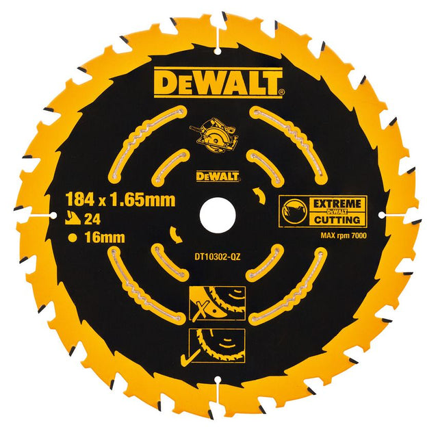 Dewalt DT10302 Extreme 2nd Fix Circular Saw Blade 184mm x 16mm x 24T The Dewalt DT10302 EXTREME 2nd Fix Circular saw blades are ideal for decorative wood cutting e.g. skirting boards, dado rails, architraves. Anti-vibration slots and ultra sharp teeth deliver a superior cut finish. They have a thin kerf to ensure less push force is required by the user, they cut straighter with reduced binding. Features: Nail tough Ultra Sharp Carbide Teeth reduces splintering Premium Grade Carbide for longer life and durability Optimised Face Shear and Face Grind for fast, accurate cutting Ultra-Thin Kerf Design for smooth cuts with reduced cutting force Anti-kickback design reinforces the carbide tip for impact resistance For use with portable and stationary saws C3 next-gen carbide up to 3 regrinds & 2x life (vs construction range) Resin-filled expansion slots dampen noise and vibration Ripping and cross-cutting natural timbers Cutting composite wood based sheet materials e.g. plywood, mdf and chipboard etc. mdf and chipboard etc. Specification: Tooth direction: Anti-clockwise Number of teeth: 24 Kerf thickness: 1.65mm Application material: Multi