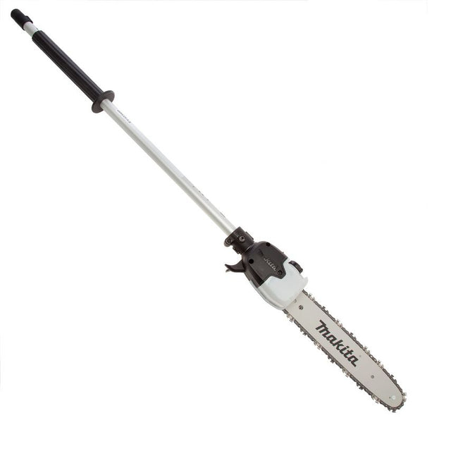 Makita EY403MP Pole Saw Attachment The Makita EY403MP Pole Saw is a small chainsaw attachment for use with Makita multi-function power head machine (Split Shaft); Cordless models DUX18, DUX60 & UX01G & Engine model: EX2650LH. Ideal for delimbing and sawing, with automatic chain lubrication and metal gears. Ideal for branching trees and shrubs. Comes with a 30cm saw bar and 3/8" chain. The integrated oil tank automatically lubricates the saw chain and is equipped with a robust metal gear for a long service life. Features: For use with models, Cordless: DUX18, DUX60 & UX01G & Engine: EX2650LH Chain oil tank with high transparency Integrated branch hook for the convenient removal of cut branches from trees Comes With: Chain guard Specification: Saw bar: 30cm Length: 1207mm Width: 88mm Height: 102mm Weight: 2.0kg