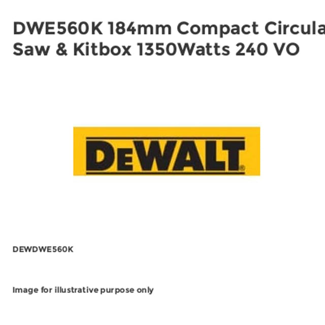 The DEWALT DWE560 Compact Circular Saw is lightweight and easy to use with a 65mm depth of cut. Its high power 1,350 Watt motor gives increased cutting performance, and the cutaway inner guard gives improved line of sight to cutting line. Has a dust blower, which clears dust and debris from the cut line. The efficient dust extraction port minimises airborne dust particles when connected to a dust extraction unit. The circular saw has direct compatibility with the DEWALT AirLock system for easy, secure connection to extraction hose. Supplied with: 24 tooth saw blade, rip fence, dust extraction spout, and blade spanner. Specifications: Input Power: 1,350 Watt.No Load Speed: 5,500/min.Max Cutting Depth: @90: 65mm, @45: 42mm.Blade: 184x16mm Bore, 24 Tooth.Bevel Capacity: 48. Length: 286mm. Height: 226mm.Weight: 3.7kg.