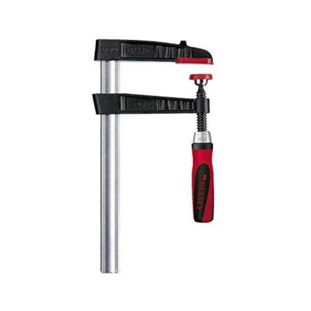Clamping force up to 6,000 N High-quality 2-component plastic handle Pressure plates can be replace by hand no tools required (from 80 mm throat depth) With protective caps on the clamping surfaces Stable profiled rail with serration BESSEY anti-slip system (from 80 mm throat depth) Integrated BESSEY anti-slip system, Maximum safety is available with the integrated BESSEY anti-slip system, when clamping with a throat depth of 80 mm or more. A set screw that is molded into the sliding arm interlocks with the serration on the rail. This effectively prevents the clamp from dislodging or slipping away. Reinforced malleable iron clamps, Both the upper and lower sections are produced from high-quality malleable iron and reinforced by shafts. The powder coating protects against corrosion and the characteristic shaft profile works as a reliable reinforcement against torsion forces. High-quality profiled rail, The BESSEY profiled rail from our own drawing plant has been especially optimised for clamps. The serration on six faces additionally prevents the clamp from slipping. Pressure plate, For enhanced serviceability the pressure plate can be changed with no need for tools. It can be replaced very easily and quickly.