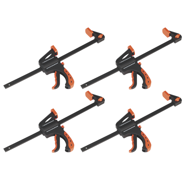 Set of four ratchet action clamps with comfort grip handle and quick release button for fast adjustment.