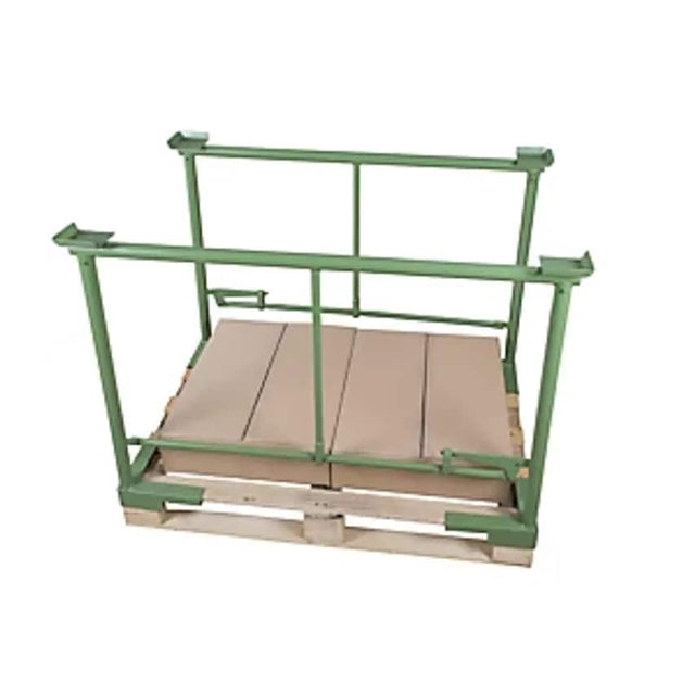 Clamp-on stacking frame, bar width 1200 mm, 1 pair, effective height 1200 mm. Supplied = flat pack. Effective height = 1200 mm. Bar width = 1200 mm. Design of stacking frame = with corner braces, with central stays. Max. load = 1000 kg. Stacking load = 2000 kg. Material = tubular steel, painted. Colour = reseda green RAL 6011. Product type = pallet frames. For four-way wooden pallets. Sturdy sheet metal feet wrap around 2 pallet corners. 1 clamping lever to hold each bar, secured by loops and central struts. Supplied complete with one pair of frames without pallet and chain. Please order chain separately. Custom models in other RAL colours on request.