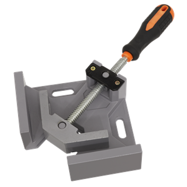 Suitable for aligning, holding and fixing materials such as wood, metal and plastic at an exact right angle. Single handle 90 corner clamp with heavy-duty aluminium alloy body and swing jaw. Rubberised anti-slip handle for ease of use.