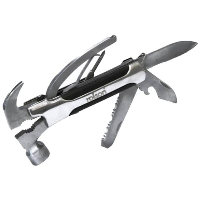 9 Function Multi - Tool Stainless Steel, with rubber inserts on grip. Nine functions include: knife blade, mini saw, nail file, bottle opener, hammer head, combination pliers, wire stripper, slotted screwdriver, crosspoint screwdriver, complete with pouch