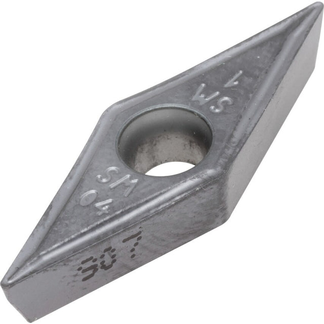 VCMT Turning Inserts 35 Rhombic Insert 7 positive flank inserts used for semi-finish and finish turning. Chip breaking in moderate feed range. Positive rake, low cutting forces. Used for a wide range of materials, including soft and exotic alloys. Insert Grade IC907 ISO Range - (P10-P30)(M05-M20)(K15-K30)(H05-H15)(S05-S20)(N05-N20) Coating - PVD TiAlN+TiN A tough sub-micron substrate, suitable for low-to-medium cutting speeds.For machining of heat resistant alloys, austenitic stainless steel and hard steel.
