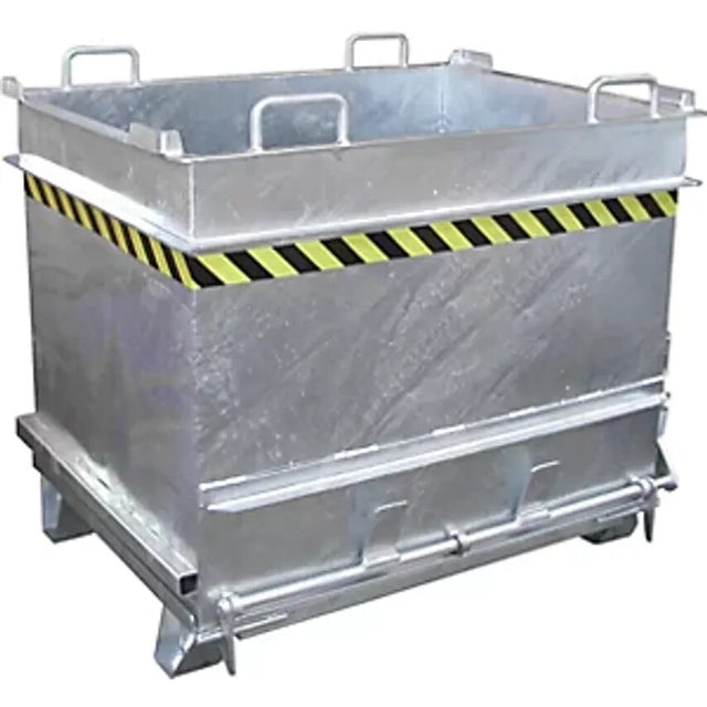 BC construction material container, with stone clamp release mechanism, WxH 1310 x 1160 mm, hot dip galvanised. Supplied = assembled. Max. load = 2000 kg. Overall width = 1310 mm. Overall length = 1035 mm. Overall height = 1160 mm. Forklift pocket spacing = 630 mm. Weight = 260 kg. Material = sheet steel. Finish = hot dip galvanised. Colour = zinc plated. Product type = hinged bottom skips. Stable construction for robust use. Bottom release. Reinforced base flap with 2 locking mechanisms. Base flap released via cable pull from the stacker seat. Can be transported with a forklift, pallet truck and crane. Special edge profile for attachment of the stone clamp on all sides.