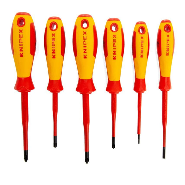 Knipex VDE Screwdrivers are manufactured from chrome vanadium molybdenum steel. Ergonomically optimised dual component handle for reduced fatigue and optimum transmission of force. The handle design also prevents rolling. VDE tested up to 10,000V and safe for work up to 1,000V. They conform to DIN EN/IEC 60900. This 6 piece set contains: 2 x Slotted Screwdrivers: 2.5 x 177mm, 4.0 x 202mm2 x Phillips Screwdrivers: PH1 x 187mm, PH2 x 212mm2 x Pozidriv Screwdrivers: PZ1 x 187mm, PZ2 x 212mm