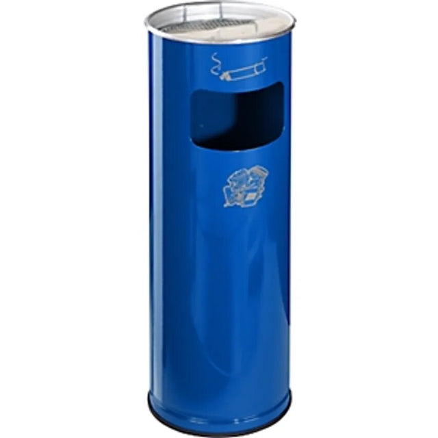 Combination ashtray, capacity 17 l, Hx 660 x 230 mm, sheet steel, gentian blue. Supplied = assembled. Waste collector material = sheet steel. Waste collector colour = gentian blue. Waste collector capacity = 17 l. Waste collector diameter = 230 mm. Ashtray material = aluminium. Ashtray colour = aluminium silver. Place of use = indoor and outdoor use. Type of mounting = free standing. Finish = powder coated. Feature = sand-fillable, round. Hood = without. Weight = 5 kg. Design of access opening = 1. Product type = pedestal combination ashtrays. Round. Aluminium ashtray insert for sand filling. Zinc plated sieve. Side deposit openings for rubbish. Powder coated, electrolytically zinc plated sheet steel. Good corrosion protection due to UV-resistant, polyester based powder coating. Zinc plated inner bin with metal bar handles as an accessory.