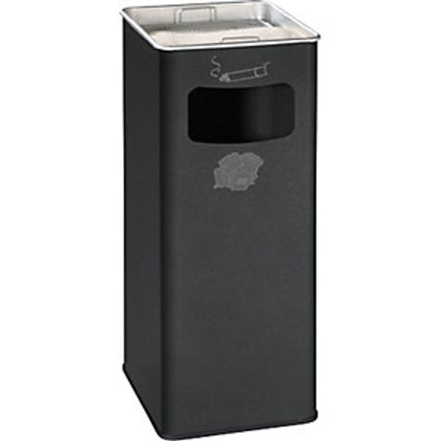 Combination ashtray, capacity 53 l, WxHxD 330 x 705 x 330 mm, sheet steel, granite. Supplied = assembled. Height = 705 mm. Width = 330 mm. Depth = 330 mm. Waste collector material = sheet steel. Waste collector colour = granite. Waste collector capacity = 53 l. Ashtray material = aluminium. Ashtray colour = aluminium silver. Place of use = indoor and outdoor use. Type of mounting = free standing. Finish = powder coated. Feature = sand-fillable, rectangular. Hood = without. Weight = 7.6 kg. Design of access opening = 1. Product type = pedestal combination ashtrays. Square. Aluminium ashtray insert for sand filling. Zinc plated sieve. Side deposit openings for rubbish. Powder coated, electrolytically zinc plated sheet steel. Good corrosion protection due to UV-resistant, polyester based powder coating. Zinc plated inner bin with metal bar handles as an accessory.