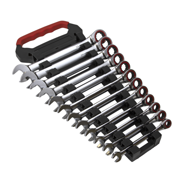 High quality slim style Chrome Vanadium steel spanners. Hardened and tempered with a fully polished micro satin finish. Ultra-smooth 100-Tooth WallDrive ratchet ring. Ideal for use where space is limited. Supplied in storage rack.