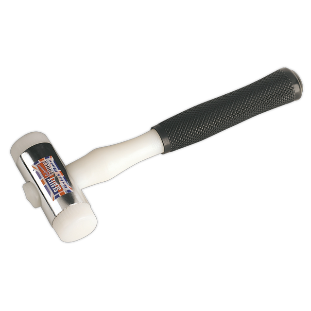 Chrome plated zinc head with two durable white nylon faces. Replacement faces available with alternative hardness.