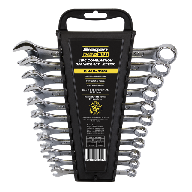 Manufactured from Chrome Vanadium steel. Fully polished heads. Made to DIN standard. Supplied in storage/carry rack.