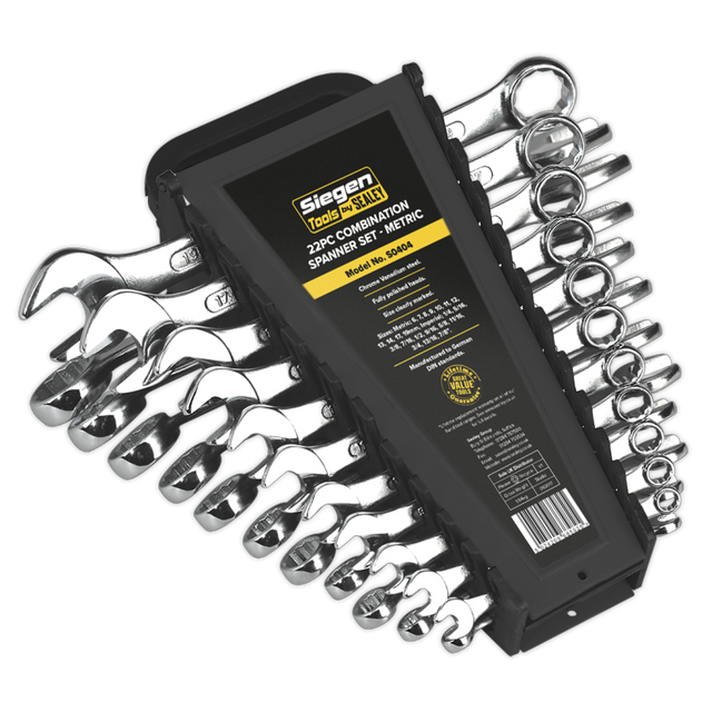 Manufactured from Chrome Vanadium steel. Fully polished heads. Made to DIN standard. Supplied in storage/carry rack.