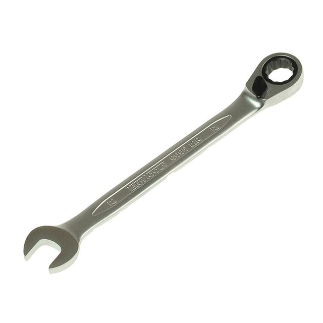 This Teng Tools ratcheting combination spanner combines an open ended spanner with a 72-tooth 12-point ring ratchet. The ratchet has a 'flip reverse' feature, which switches the direction of the ratchet, and it is offset at a 13 angle for ease of access. Both ends are of the same size. The spanner is made from chrome vanadium steel for strength and durability, and has an attractive satin finish.