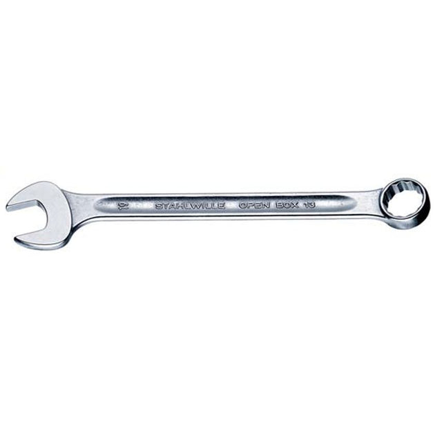 Stahlwille Series 13 Combination Spanners. Metric sizes, with 15 offset ring end. They are drop forged from high-grade chrome alloy steel and chrome plated. Manufactured to DIN 3113 form A/ISO 7738 form A. The spanners are optimally hardened in continuous furnaces with no scale build-up or skin decarburisation and gently quenched in oil. They are extremely strong yet lightweight due to Stahlwilles's 'double-T profile'. Stahlwille's unique plating method prevents the problem of chrome flaking. The ring end of the spanners are equipped with an Anti-Slip Drive profile. This permits high transmission of forces to the flats of the nuts and bolts without damaging them. Made in Germany. Stahlwille Combination Spanner. Size 14mm. Length 165mm.