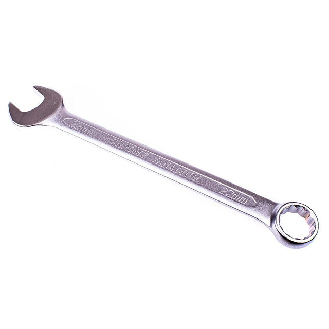22mm combination spanner with straight open and 15 offset 12 point (12PT) ring end for easier use on flat surfaces. Made of hardened and tempered Chrome Vanadium (Cr-V) steel for maximum performance and durability. Matt finish for resistance to corrosion.