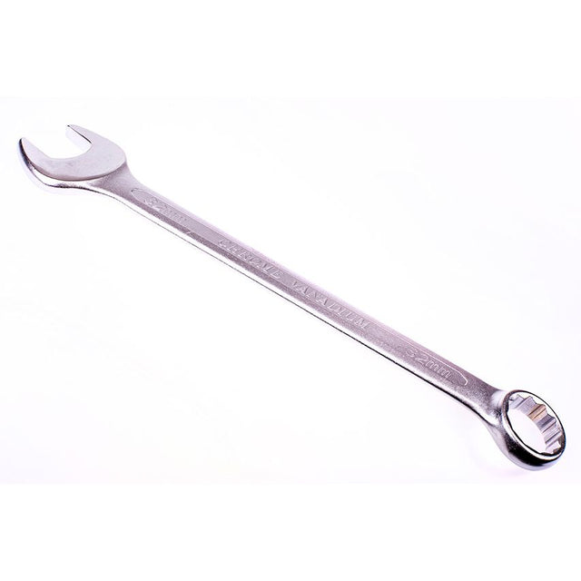 32mm combination spanner with straight open and 15 offset 12 point (12PT) ring end for easier use on flat surfaces. Made of hardened and tempered Chrome Vanadium (Cr-V) steel for maximum performance and durability. Matt finish for resistance to corrosion. Specification: Size - 32mm Total length - 360mm