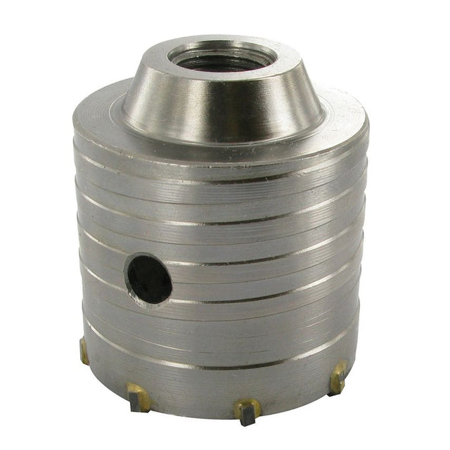 Heavy duty steel body core drill with TCT cutting tips. Ideal for cutting clean holes in burnt clay brick, sand lime brick, asphalt, concrete and aerated concrete blocks. For use with 1/2" BSP compatible arbors and drills equipped with a safety clutch. Can be used in hammer and rotational modes.
