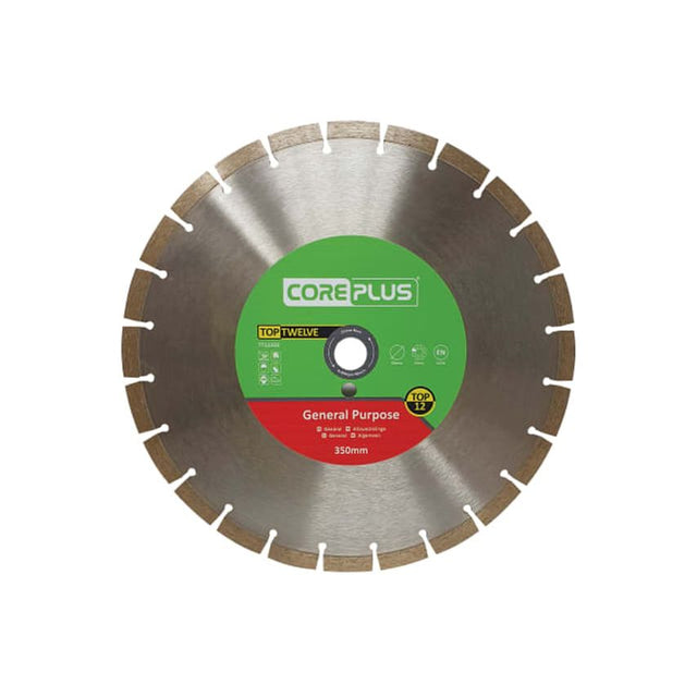 CorePlus Top Twelve General Purpose Cutting Blades provide low cost cutting in a wide variety of building materials. The blades, with premium graded quality diamond segments, and a tensioned high grade steel core, were manufactured to EN 13236 quality standards. Suitable for cutting; concrete, concrete lintels, reinforced concrete lintels, hard sandstone, concrete pipes, concrete paving slabs, bricks, block paving slabs, concrete kerbs, clay pipes, hard slate, roofing tiles, quarry tiles, etc. Specification: Segment Height: 12mm.