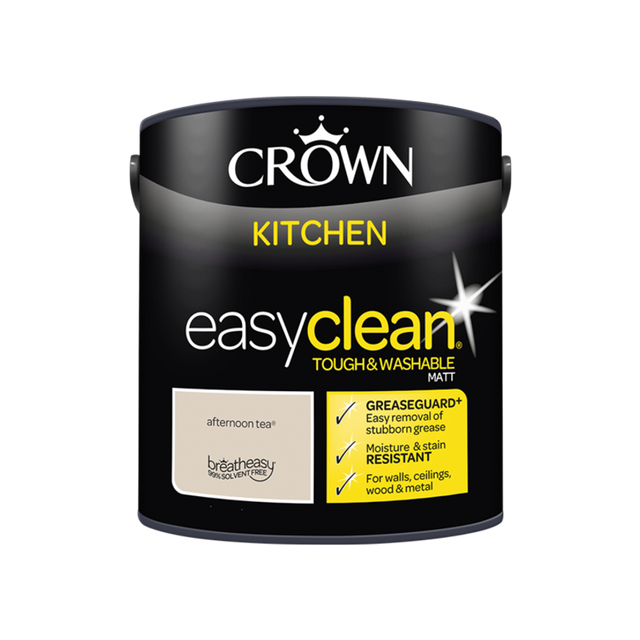 Crown Easyclean Kitchen Matt 2.5L Afternoon Tea Available in 16 on trend colours Tough and washable Matt finish (Ideal for high traffic areas) Greaseguard+ formulation, easy removal of stubborn grease Moisture and stain resistant Multi-surface. Great for Walls, Ceilings, Wood and metal Crowns unique Breatheasy formulation (Virtually odour free) Certified by the Asthma and Allergy Association 100% recycled packaging Mumsnet 98% of mumsnet users recommended Easyclean Matt