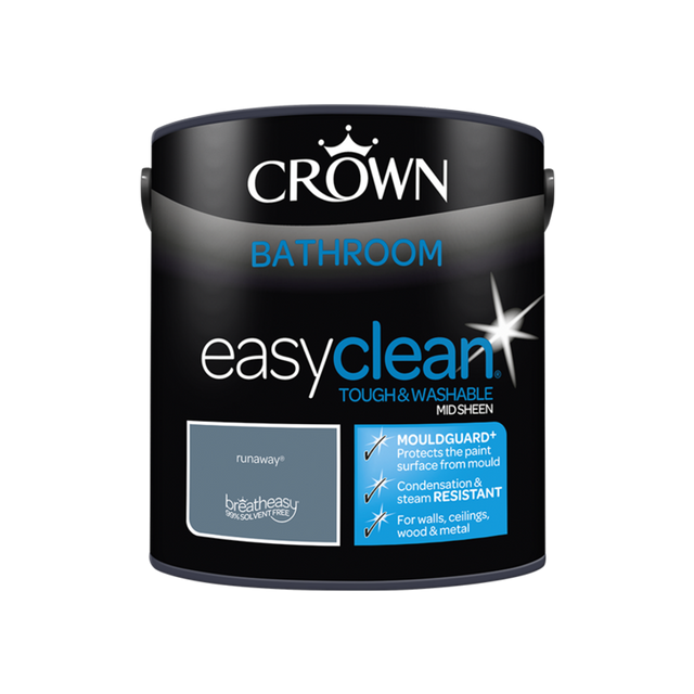 Crown Easyclean Bathroom Mid Sheen 2.5L Runaway Available in 16 on trend colours Tough and washable Mid Sheen finish (Ideal for high traffic areas) Mouldguard+ formulation, protects paint surface against mould Condensation and steam resistant Multi-surface. Great for Walls, Ceilings, Wood and metal Crowns unique Breatheasy formulation (Virtually odour free) Certified by the Asthma and Allergy Association 100% recycled packaging Mumsnet 98% of mumsnet users recommended Easyclean Matt Due to geographical locations we are unable to deliver to: Isle of Wight, Isle of Man and Ireland.