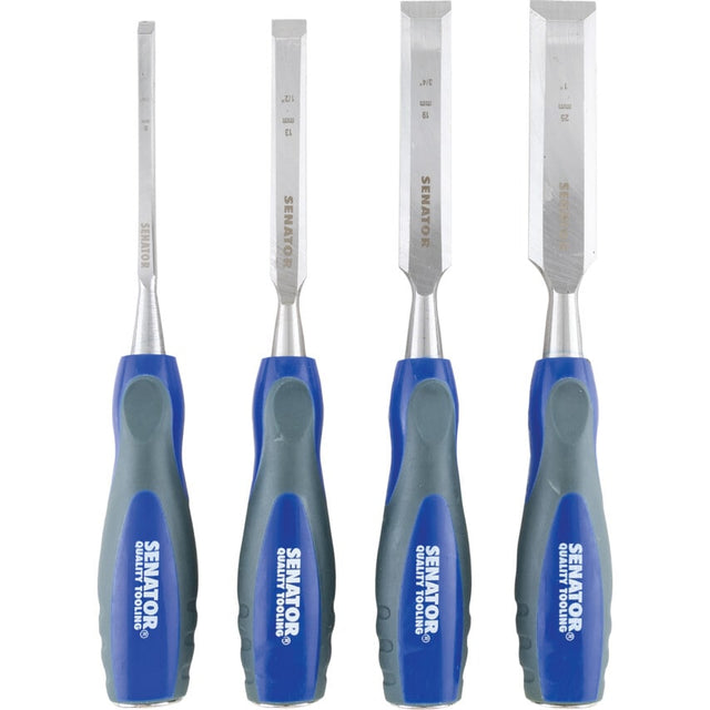 Contents: 6mm (1/4), 13mm (1/2), 19mm (3/4) and 25mm (1) chisels.