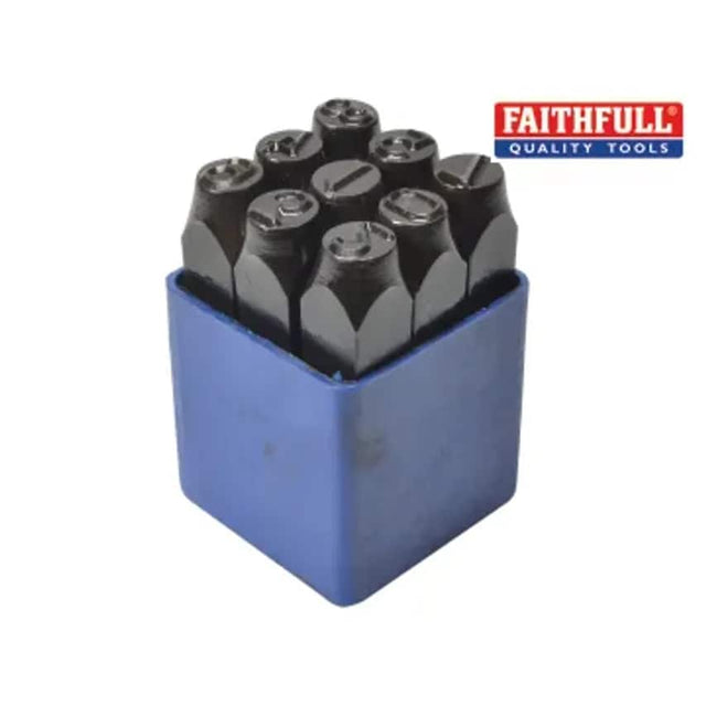 Faithfull Letter and number punches are used for hand marking metals and other hard materials. They are useful for stamping personal identification or post codes on tools, cycles etc., as frequently recommended by police and insurers. The letter or number sizes as shown, relate to the height of the characters. The punches are manufactured from high quality tested carbon steel with double induction hardened heads to ensure high quality impressions. The body is hardened and the head is tempered to prevent chipping when hammered.Contents : 1, 2, 3, 4, 5, 6, 7, 8, 9, 0 (9 is achieved by reversing 6).Set supplied in plastic box.