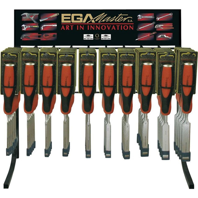 DISPLYA OF 60 FIRMER CHISELS WITH ORANGE-BLACK PLASTIC HANDLE