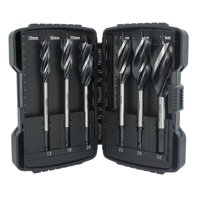 5 Cutting spurs ensuring a smooth, fast and clean cut in all types of wood. Desgined for a fast, smooth and clean cut. Wings gives faster chip ejection while threaded tip gives self centring and self feeding. Tapered flute means less binding. Set includes 13, 16, 20, 22, 25, 32mm bits.
