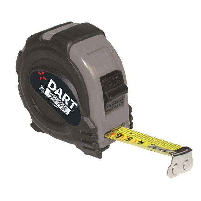 DART professional, robust tape measure with 30% thicker blade which triples the durability. The magnetic ended hook makes it easy to use when working with metal and enables the user to take measurments single handed. The rubber casing reduces breakage on impact and the matt finish of the tape makes it easier to read measurments. It features strong and positive recoil action. The II Accuracy Mark (Roman Numeral 2) gives any site foreman confidence of the accuracy when using the tapes on site.