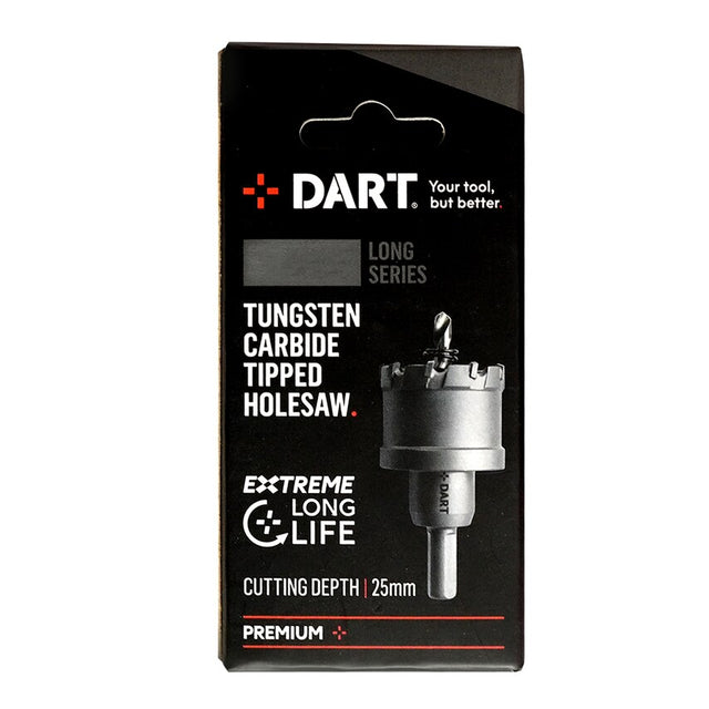 DART Long Series Carbide Tipped Holesaw for extreme long life and durability in stainless steel and tough alloys. It has tungsten carbide teeth and a solid body design for industrial use, and provides a fast and accurate cutting action. It is reccommended to use with coolant, and the internal spring allows for continous drilling without clogging. It is suitable for cutting non-ferrous metals, steel, stainless steel, aluminum, metal, mild steel, sheet metal, cast iron and plastic up to 25mm thick.