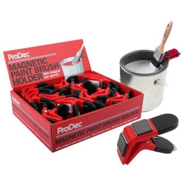 An innovative 2-in-1 paint tool including paint brush holder and can opener. Providing a simple way to rest a paint brush whilst carrying out other painting tasks (or taking a break!). A magnetic brush holder that simply clips to the side of a paint can; the magnet attaches to the metal ferrule allowing drips to fall back into the paint can.