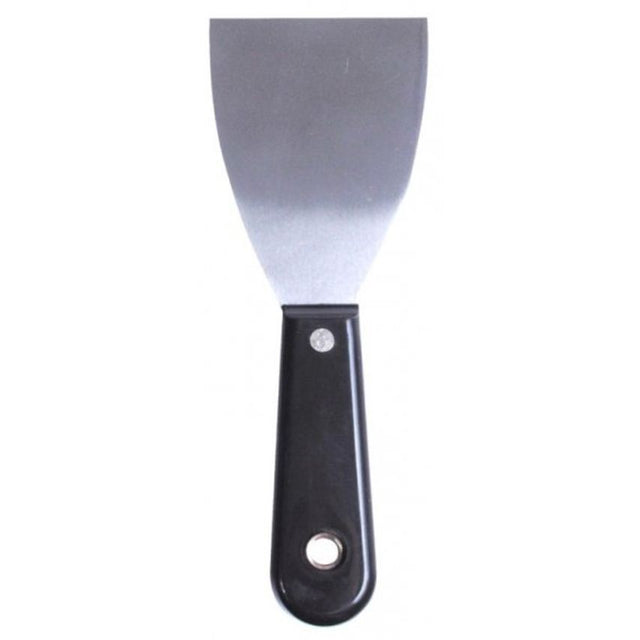 Budget 3" paint scraper with black plastic handle. No packaging.