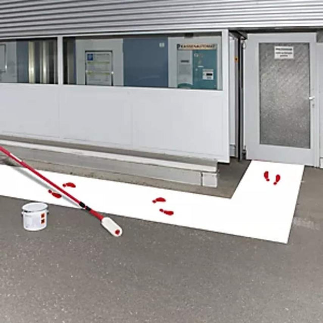 Outdoor marking paint, capacity 5 l, traffic white RAL 9016. Supplied = assembled. Colour = traffic white RAL 9016. Contents = 5 l. Drying time = 60 min. Hazard class = GHS02, GHS07, GHS08. Product type = outdoor marking paints. Dries fast with good coverage. Very robust and durable. Largely resistant to oil. Excellent adhesion. Weather resistant. Hardwearing. Silicone free. High quality, single component marking paint with extremely low abrasion Especially developed for marking areas and stripes on surfaces and traffic areas within a company. Adheres to concrete, screed, asphalt and composite stone Easy to use. Paint application using a roller (for larger surfaces) , brush or by spraying.