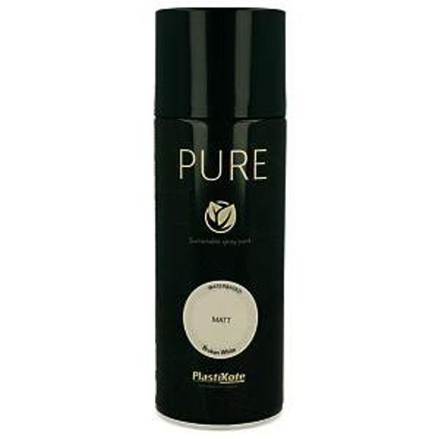 PlastiKote Pure Broken White The PlastiKote Pure Matt Spray Paint is the most sustainable premium spray paint with over 96% of the solvents have been replaced by water in a new, quick-drying and odourless quality. The Plastikote pure range comes in a new can which is manufactured with 70% less CO2 impact than a standard can. The cap is 100% recycled even suitable for outdoor objects. For nearly all surfaces even suitable for use on polystyrene. Available is a wide range of premium colours