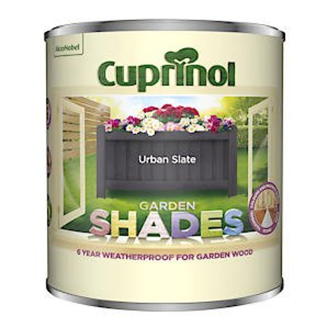 Cuprinol 5316967 Garden Shades Exterior Woodcare, Urban Slate 1 Litre The Cuprinol Garden Shades are a water based exterior wood paint specially developed to colour and protect. It can be used on most exterior woods including sheds, fences, log cabins and furniture. It's also ideal for smaller exterior projects as it can be applied to terracotta, brick and stone. Special pigments give you a rich colour that enhances the natural wood grain whilst giving 6 years protection. Available in wide variety of Garden Enhancing colours and registered distributors.