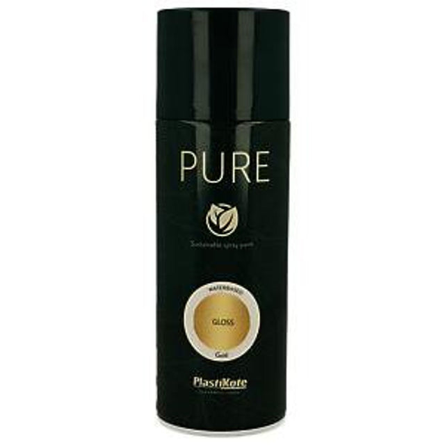 PlastiKote Pure Gold The PlastiKote Pure Matt Spray Paint is the most sustainable premium spray paint with over 96% of the solvents have been replaced by water in a new, quick-drying and odourless quality. The Plastikote pure range comes in a new can which is manufactured with 70% less CO2 impact than a standard can. The cap is 100% recycled even suitable for outdoor objects. For nearly all surfaces even suitable for use on polystyrene. Available is a wide range of premium colours