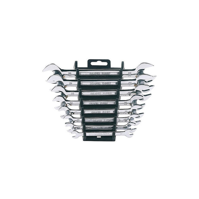 Forged from chrome vanadium steel hardened, tempered, chrome plated and fully polished. Open ends set at 15. Supplied on wall mountable plastic rack. To DIN3110.
