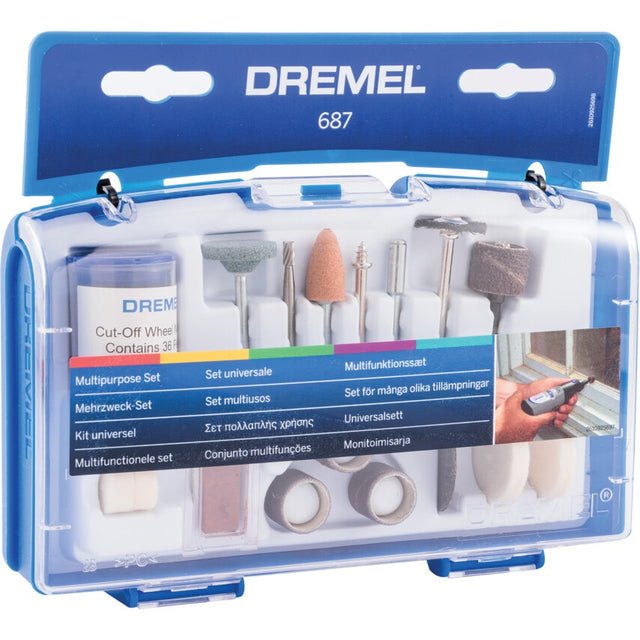 The Dremel 687 Multipurpose Cutting Kit (80449) offers a comprehensive selection of 52 best-selling accessories, all neatly packaged in a convenient box. With a removable accessory tray and three dividers, this kit provides an organised and easily accessible storage solution for your Dremel tools. Ideal for various applications, the assortment ensures versatility and efficiency in your cutting tasks. Upgrade your toolkit with this multipurpose cutting kit for a reliable and well-organised accessory set. Features and Benefits Dremel multipurpose accessory set (687) contains an assortment of Dremel's best selling accessories in a convenient box 52 rotary tool accessories for cutting, carving, sanding, cleaning, polishing, grinding and sharpening In reusable case with removable accessory tray and 3 dividers to provide convenient storage solution The included Dremel quick start leaflet explains all included accessories Includes High Speed Cutter 3,2 mm (194) , Aluminum Oxide Grinding Stone 9,5 mm (952), Silicon Carbide Grinding Stone 19,8 mm (85422), Bristle Brush 19 mm (403), 2 x Polishing Wheel 13 mm (414) 2 x Polishing Wheel 26 mm (429), Polishing Compound (421), 36 x Cut-Off Wheel 24 mm (409), Fiberglass Reinforced Cut-Off Wheel 32 mm (426), Sanding Band & Mandrel 13 mm grit 60 (407), Sanding Band 13 mm 60 grit (408), 2 x Sanding Band 13 mm 120 grit (432), Mandrel (401), Mandrel (402)
