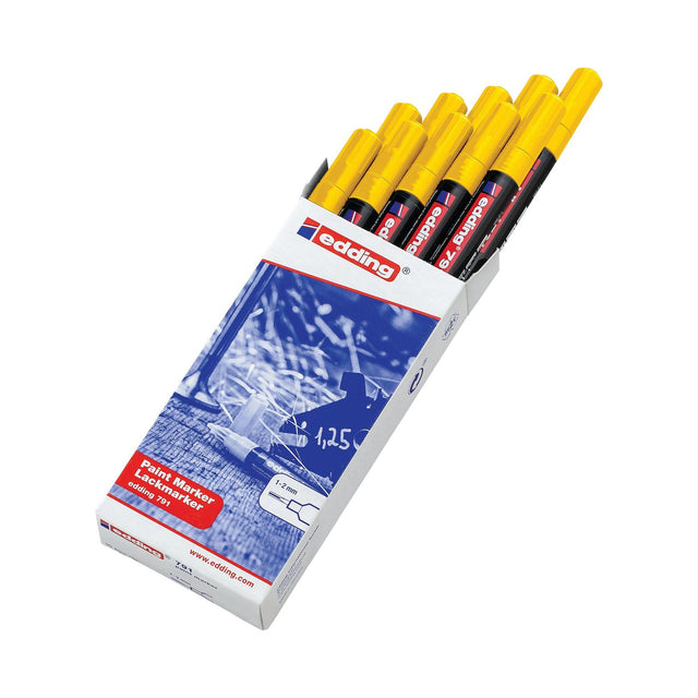 The edding paint marker has a line width of 2-4mm for permanent marking of all surface including: Metal, wood, glass, plastic, leather, porcelain, foils, cables and rubber. Suitable for making the markings clearly visible even in unfavourable light conditions, these paint markers are the perfect solution for marking in tough conditions. The paint marker's highly permanent ink is lightfast, fast-drying, highly opaque and smudge-proof. Durable indoors and outdoors these high quality, opaque yellow markers are supplied in a folding box of 10.