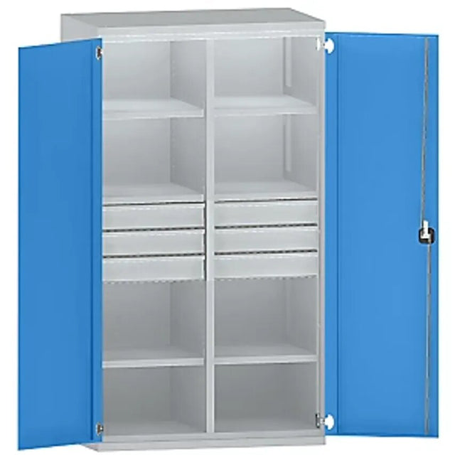 Heavy duty cupboard made of steel, 6 shelves, 6 x 120 mm high drawers, light grey/light blue. Supplied = assembled. Height = 1950 mm. Width = 1085 mm. Depth = 630 mm. Design = welded. Internal fittings = 6 shelves, 6 drawers, centre partition. Max. cupboard load = 1200 kg. Housing material = steel. Door material = steel. Shelf material = zinc plated. Body colour = light grey RAL 7035. Door colour = light blue RAL 5012. Max. shelf load = 160 kg. Number of shelves = 6 pcs. Door type = hinged door. Opening angle of doors = 270 . Extreme high load capacity: max. shelf load 160 kg - max. cupboard load 1200 kg. Huge amount of storage space: depth 630 mm. Can be extended by adding additional shelves, drawers and accessories. Welded steel construction. Strong holding profiles. Body always in light grey RAL 7035. Hinged doors with recessed rotary handle and integrated cylinder security lock, incl. 2 keys. Cupboards can be expanded as required (accessories) Height adjustable in 30 mm increments. Max. load capacities Shelves 160 kg and drawers 100 kg. Drawers On smooth roller guides, 100 % extension. Internal drawer dims. WxD 450 x 540 mm. Your advantage Secure, convenient and orderly storage of heavy parts.