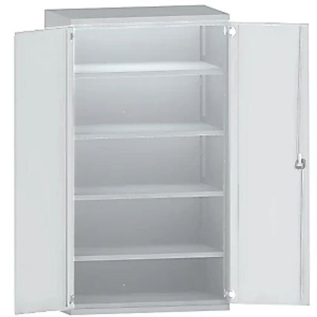 Heavy duty cupboard made of steel, 4 full-width shelves, light grey/light grey. Supplied = assembled. Height = 1950 mm. Width = 1085 mm. Depth = 630 mm. Design = welded. Internal fittings = 4 shelves. Max. cupboard load = 1200 kg. Housing material = steel. Door material = steel. Shelf material = zinc plated. Body colour = light grey RAL 7035. Door colour = light grey RAL 7035. Max. shelf load = 160 kg. Number of shelves = 4 pcs. Door type = hinged door. Opening angle of doors = 270 . Extreme high load capacity: max. shelf load 160 kg - max. cupboard load 1200 kg. Huge amount of storage space: depth 630 mm. Can be extended by adding additional shelves, drawers and accessories. Welded steel construction. Strong holding profiles. Body always in light grey RAL 7035. Hinged doors with recessed rotary handle and integrated cylinder security lock, incl. 2 keys. Cupboards can be expanded as required (accessories) Height adjustable in 30 mm increments. Max. load capacities Shelves 160 kg. Your advantage Secure, convenient and orderly storage of heavy parts.