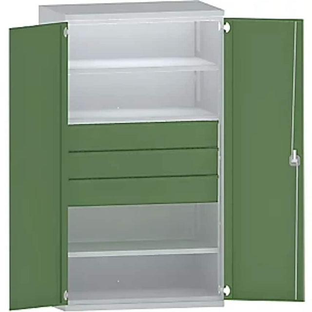 Heavy Duty Cupboard Steel, 3 Shelves, 3 X 180mm High Drawers, Light Grey/Reseda Green