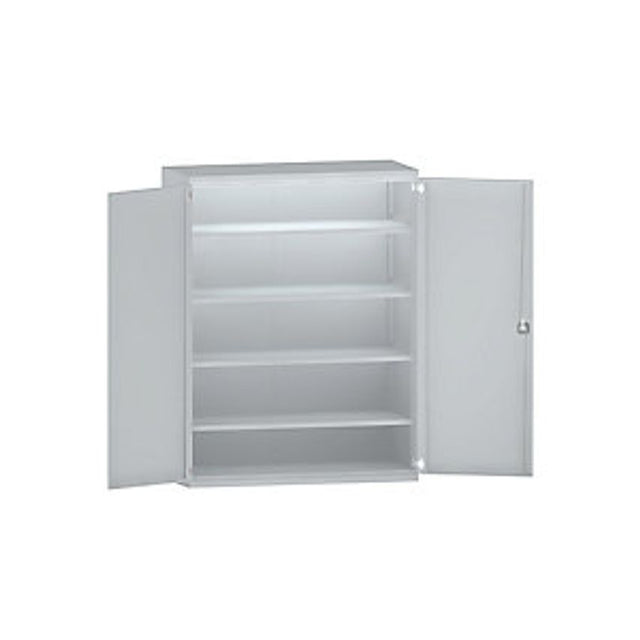 JUMBO heavy duty cupboard made of sheet steel, 4 full-width shelves, light grey/light grey. Supplied = assembled. Height = 1950 mm. Width = 1485 mm. Depth = 630 mm. Design = welded. Internal fittings = 4 shelves. Max. cupboard load = 1200 kg. Housing material = sheet steel. Door material = sheet steel. Finish = powder coated. Shelf material = zinc plated. Body colour = light grey RAL 7035. Door colour = light grey RAL 7035. Max. shelf load = 160 kg. Number of shelves = 4 pcs. Shelf height adjustment increments = 30 mm. Door type = hinged door. Opening angle of doors = 270 . 1485 mm wide and 630 mm deep - more storage space than (almost) any other cupboard. Particularly high max. shelf and housing loads. Ideal for large, heavy and bulky parts. Sturdy, powder coated sheet steel construction. Body always in light grey RAL 7035. Strong holding profiles. Lockable with security cylinder lock. Shelves height adjustable in 30 mm increments. Max. load capacities Shelves 160 kg. Your advantage Huge storage space for particularly heavy items.