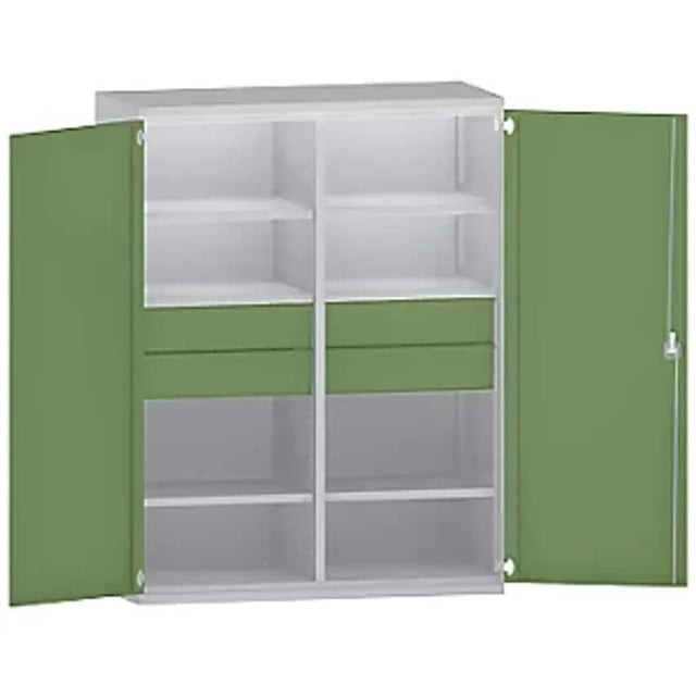 JUMBO heavy duty cupboard made of sheet steel, 6 shelves, 4 x 180 mm high drawers, light grey/reseda green. Supplied = assembled. Height = 1950 mm. Width = 1485 mm. Depth = 630 mm. Design = welded. Internal fittings = 6 shelves, 4 drawers, centre partition. Max. cupboard load = 1200 kg. Housing material = sheet steel. Door material = sheet steel. Finish = powder coated. Shelf material = zinc plated. Body colour = light grey RAL 7035. Door colour = reseda green RAL 6011. Max. shelf load = 160 kg. Number of shelves = 6 pcs. Shelf height adjustment increments = 30 mm. Door type = hinged door. Opening angle of doors = 270 . 1485 mm wide and 630 mm deep - more storage space than (almost) any other cupboard. Particularly high max. shelf and housing loads. Ideal for large, heavy and bulky parts. Sturdy, powder coated sheet steel construction. Body always in light grey RAL 7035. Strong holding profiles. Lockable with security cylinder lock. Shelves and drawers height adjustable in 30 mm increments. Max. load capacities Shelves 160 kg and drawers 100 kg. Drawers On smooth roller guides, 100 % extension. Internal drawer dims. WxD 650 x 540 mm. Your advantage Huge storage space for particularly heavy items.