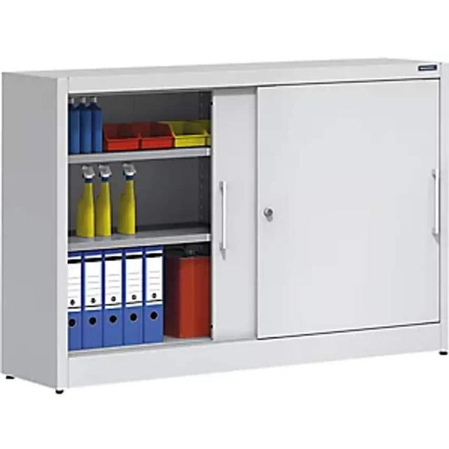 Sliding door cupboard, height 1000 mm, with centre partition and 2 x 2 shelves, width 1500 mm, depth 600 mm, doors in light blue RAL 5012. Supplied = assembled. Height = 1000 mm. Width = 1500 mm. Depth = 600 mm. Internal depth = 544 mm. Internal fittings = centre partition and 2x2 shelves. Housing material = sheet steel. Door material = sheet steel. Finish = stove enamelled. Shelf material = sheet steel, galvanised. Body colour = light grey RAL 7035. Door colour = light blue RAL 5012. Max. shelf load = 75 kg. Shelf colour = zinc plated. Number of shelves = 4 pcs. Shelf width = 727 mm. Shelf height adjustment increments = 25 mm. Door type = sliding door. For storage space in the workshop, office, warehouse and archive. No awkward double doors - ideal where space is tight. Zinc plated, height adjustable shelves - max. load 75 kg. Rotary cylinder lock with replaceable core. Solid sheet steel construction. Smooth running sliding doors with attractive handles and rotary cylinder lock with replaceable core. Closes quietly due to rubber buffers. High-quality powder coating. Body always in light grey RAL 7035. Effective cupboard depth = depth minus 56 mm. Shelves Made of zinc plated sheet steel. Max. load 75 kg. Height adjustable in increments of 25 mm.