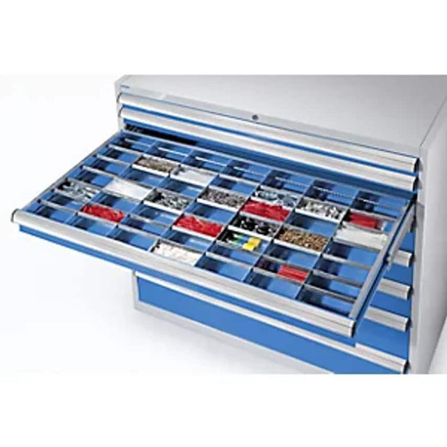 Drawer divider set, 6 longitudinal dividers, 7 cross dividers, for drawer height 100 mm. Supplied = assembled. For width = 1300 mm. For depth = 750 mm. For drawer height = 100 mm. Number of longitudinal dividers = 6 pcs. Number of cross dividers = 7 pcs. Product type = accessories. Zinc plated dividers. Simple plug-in system.