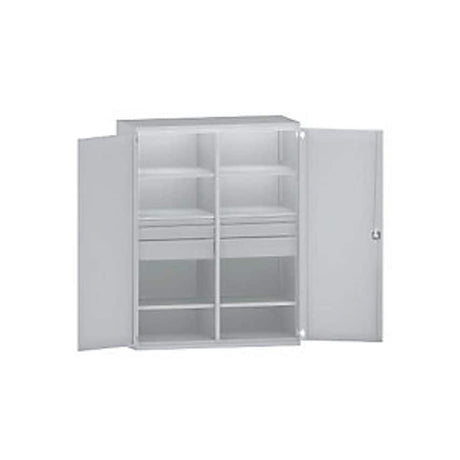 Heavy Duty Cupboard Steel - 3 Shelves - Drawers 3 X 120mm, 1 X 180mm High, Light Grey/Reseda Green