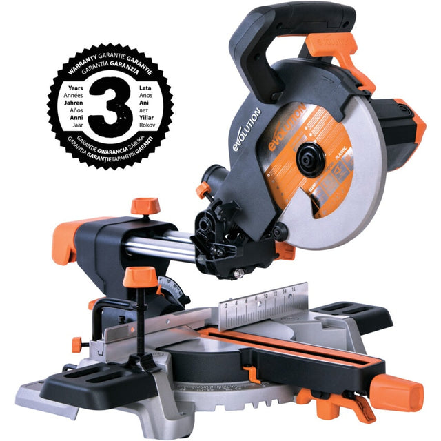 A compound mitre saw complete with Evolution Rage multipurpose cutting technology. TCT blade can easily cut through wood, aluminium and mild steel, even if nails are still embedded in the material. The multipurpose blade cuts cleanly and leaves no burrs on steel.